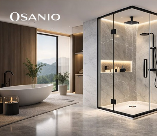 One-stop supply: vanity, smart mirror, bathtub, shower enclosure, plus matching accessories.